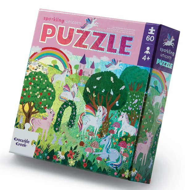 Kids Love Unicorns! Girls are fascinated by the fanciful world of unicorns, rainbows and palaces. This is a puzzle to love with its beautiful scene featuring a wondrous world of unicorns. Printed on holographic foil.