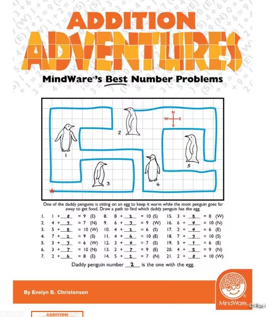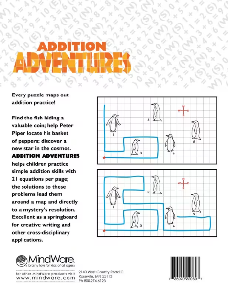 Every puzzle maps out addition practice! Kids will find the fish hiding a valuable coin, help Peter Piper locate his basket of peppers, discover a new star in the cosmos and solve dozens of other mini-mysteries. Addition Adventures helps children practice simple addition skills with 21 equations per page, and gain valuable map reading skills as they travel north, south, east and west to find the final answer. This book includes 30 single-page mini-mysteries plus illustrated solutions. Outstanding as a springboard for creative writing and other cross-disciplinary applications. Softcover; 48 pages. Reproducible for single-classroom use.