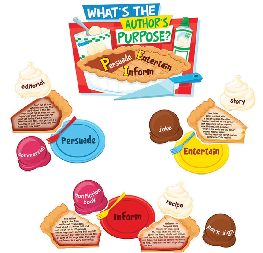 Give students a taste of author's purpose with this fun and informative bulletin board! Coordinating plates, pie pieces, and toppings give students examples of Persuasive, Informative, and Entertaining text. A teacher's guide offers a variety of writing activities and reproducibles to reinforce learning. Set of 19 pieces.