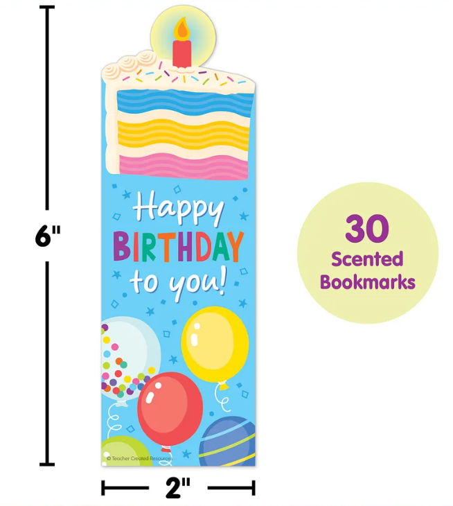 Celebrate every student’s birthday and encourage reading with a scented surprise! Featuring colorful designs and a cake scent, these bookmarks are the perfect prize for making every student feel seen on their special day. Tuck into books during library events, or drop into gift bags for every child’s birthday. Each pack includes 30 pieces. Each bookmark measures 2" x 6".