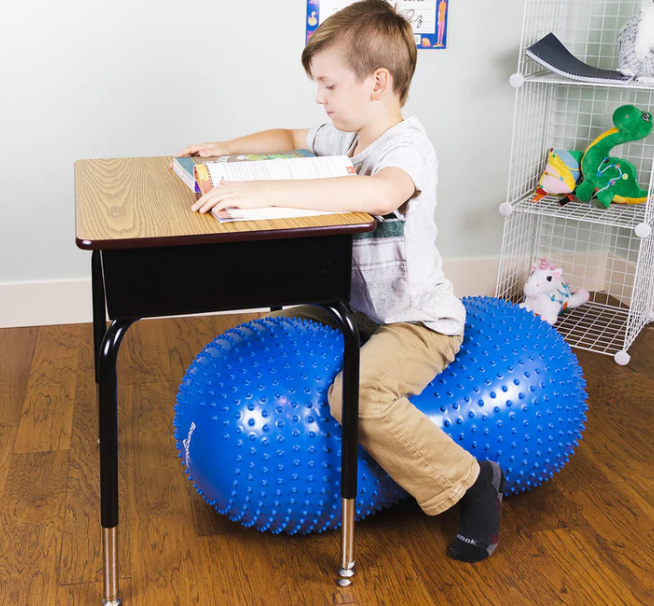 Deep pressure applied when sitting, lying across or leaning on the ball, calms, relaxes and quiets kids giving a sense of security and well-being.