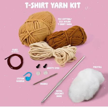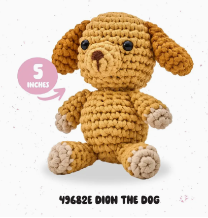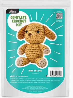 Jump into a world where creativity meets cuteness with the hot trend of Amigurumi, the Japanese art of crocheting small whimsical creatures. From cuddly animals to sweet treats, Amigurumi kits include everything you need to bring your new friends to life. Whether you are a seasoned crocheter or new to the craft, the step-by-step video instructions make it easy and fun to learn. Everything you need to create a new playful, soft friend comes inside this kit. The kit includes 75% cotton/25% nylon t-shirt yarn, metal crochet hook, metal needle, plastic safety eyes, stuffing, stitch marker, complete written instructions, and a QR code with a full stitch-a-long video. Dion the Dog is approximately 5” x 3.5” x 2.75”. The size may vary depending on the tightness of your stitching.