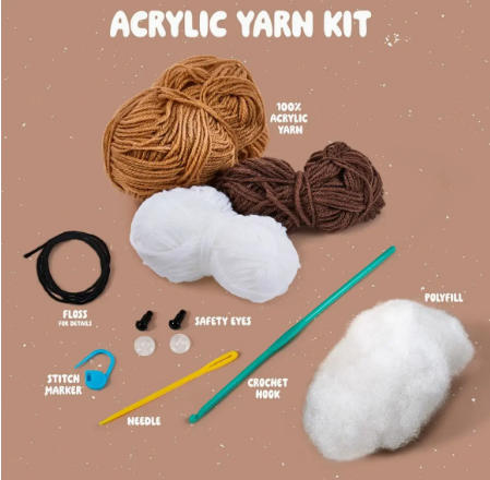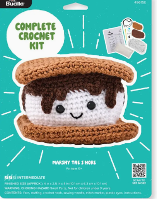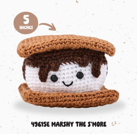Jump into a world where creativity meets cuteness with the hot trend of Amigurumi, the Japanese art of crocheting small whimsical creatures. From cuddly animals to sweet treats, Amigurumi kits include everything you need to bring your new friends to life. Whether you are a seasoned crocheter or new to the craft, the step-by-step video instructions make it easy and fun to learn. Everything you need to create a new playful, soft friend comes inside this kit. The kit includes 100% acrylic yarn, plastic crochet hook, plastic needle, plastic safety eyes, stuffing, stitch marker, complete written instructions, and a QR code with a full stitch-a-long video. Marshy the S'more is approximately 4” x 2.5” x 4”. The size may vary depending on the tightness of your stitching.