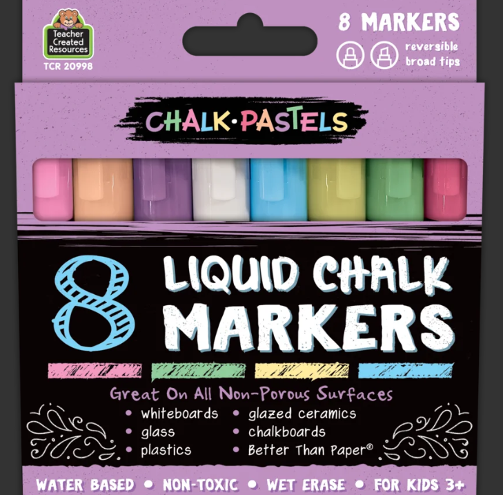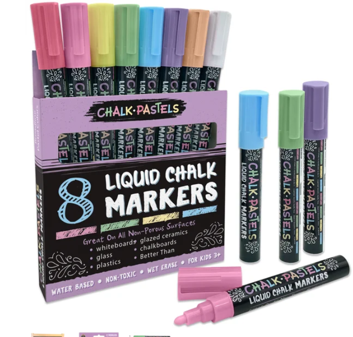 Chalk Brights Liquid Chalk Markers are broadline markers with reversible tips for either thick or thin lines. They are water based, non-toxic, and wet erase. Clean with water to easily change up your art! Great on all non-porous surfaces. Includes 8 markers. For ages 3+.