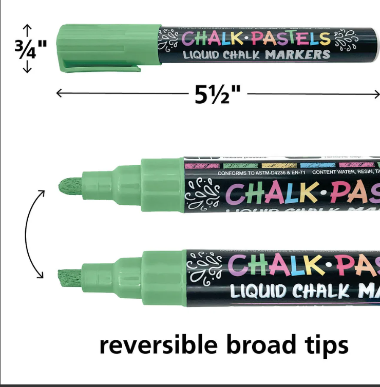 Chalk Brights Liquid Chalk Markers are broadline markers with reversible tips for either thick or thin lines. They are water based, non-toxic, and wet erase.