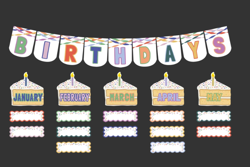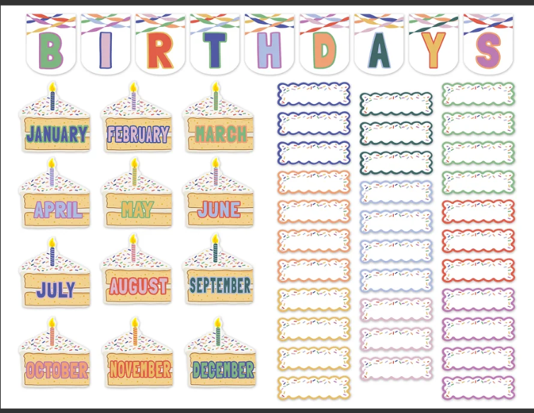 Bring the most festive vibe to any birthday celebration with this colorful bulletin board set! Featuring modern colors, sprinkle and streamer designs, and easy-to-read words, these accents bring a celebratory feel to your classroom