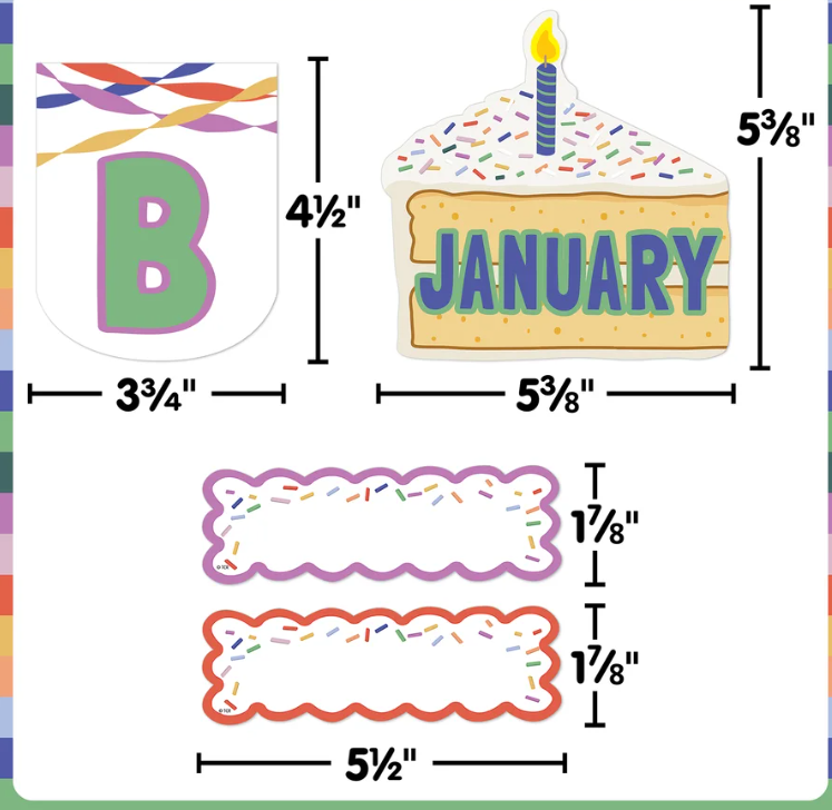 Bring the most festive vibe to any birthday celebration with this colorful bulletin board set! Featuring modern colors, sprinkle and streamer designs, and easy-to-read words, these accents bring a celebratory feel to your classroom. Hang cake headers, name tags, and pennant pieces for a customizable wall display that recognizes every birthday, to ensure they feel seen and special in a cheerful learning environment. Features 53 pieces. Each pennant piece measures 3-3/4" x 4-1/2".