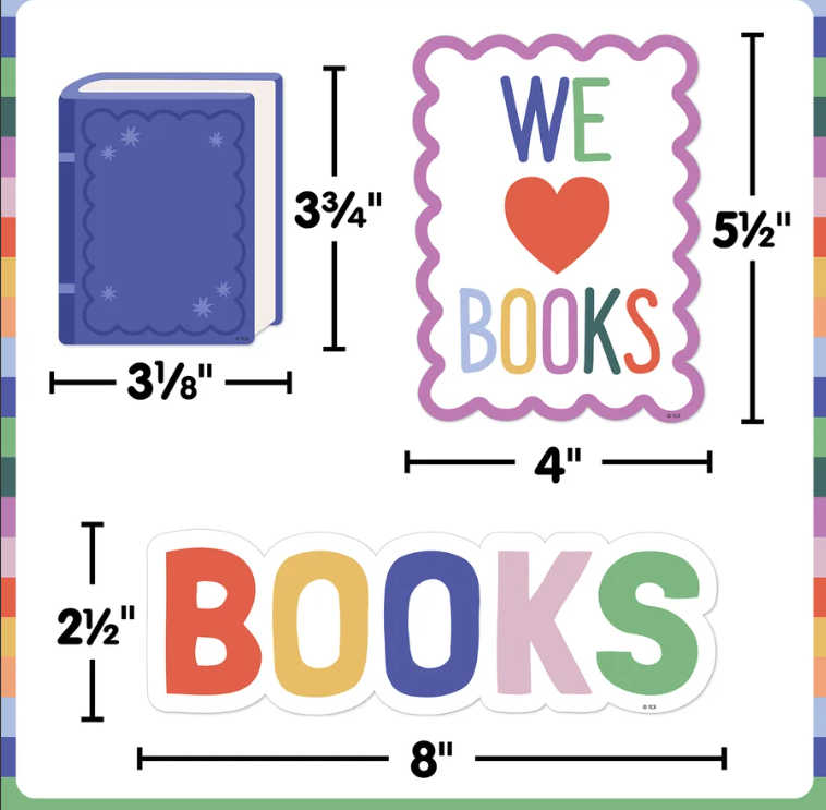 Make reading a daily habit in your classroom with this trendy bulletin board set. Featuring modern colors, accents, and a positive message, this set elevates any wall, door, or bulletin board. Adorn in your class library to get students excited to pick out new titles. Encourage kids to write their favorite book titles on the accents to create a “Book Recommendations” bulletin board. The options are endless! 59 total pieces. Scalloped shelves measure about 21" x 1-1/2".