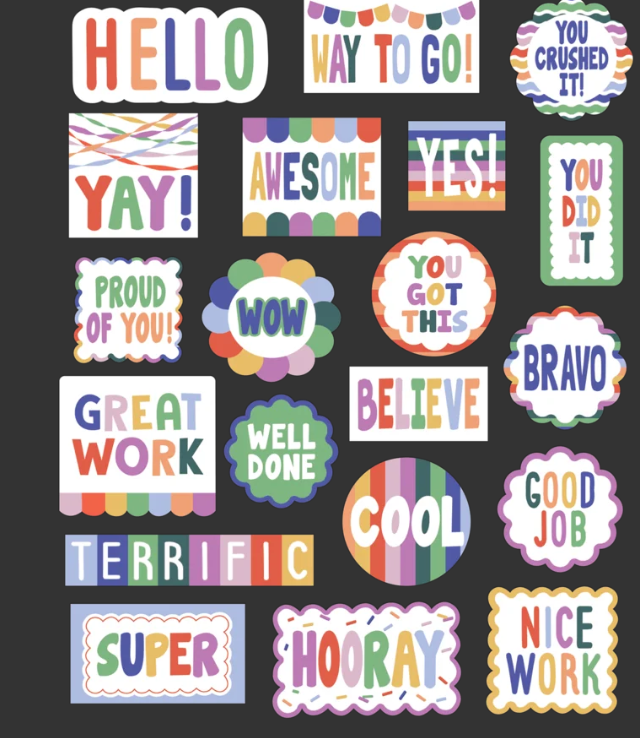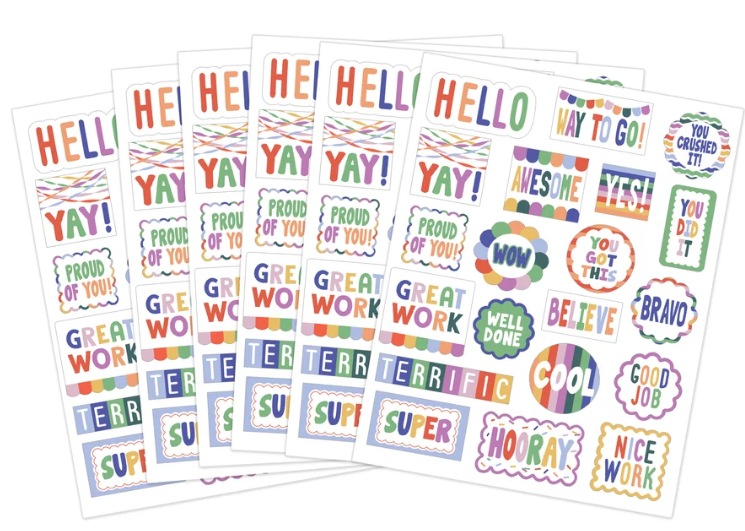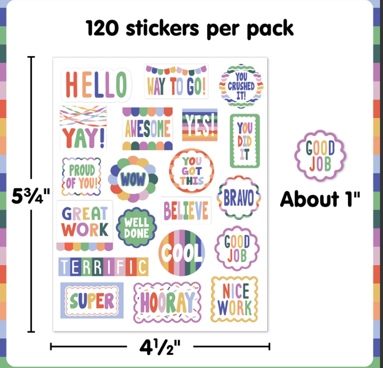 Motivate students to stay on-task and complete their work with these stickers. Featuring modern designs, bright colors, and uplifting words, these stickers are ideal for grading papers, decorating assignments, or adding a special touch to classroom activities. Use them as a tool for positive reinforcement or to celebrate creativity, effort and everyday accomplishments. Every pack includes 120 stickers in 20 different designs. Measurements vary from about 1-7/8" to 3/8".