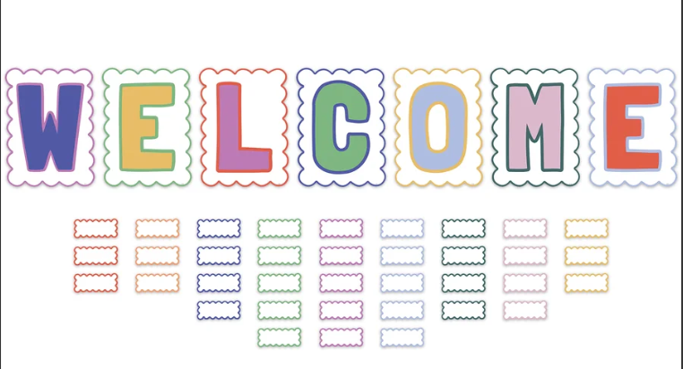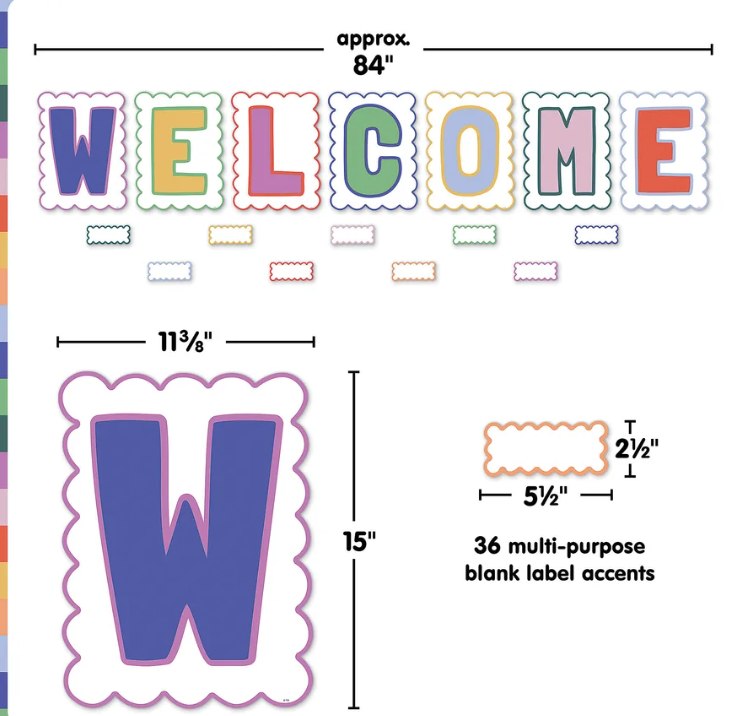 Greet students at the beginning of the school year with this wall display. Featuring trendy colors, scalloped edges, and an easy-to-read message, this sign is ideal for saying hello to attendees who visit the office, library, sports game, or any other school event. Multi-purpose blank accents can be used as name plates, or to label bins, desks, and learning centers. 43 total pieces. Each letter measures about 11-3/8" x 15". Tags are 5-1/2" x 2-1/2".