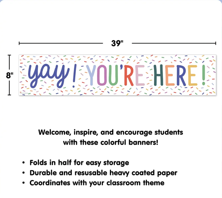 Create a celebratory vibe in any classroom with this colorful banner. Featuring modern fonts, easy-to-read text, and a sprinkle design, this banner is perfect for special occasions.