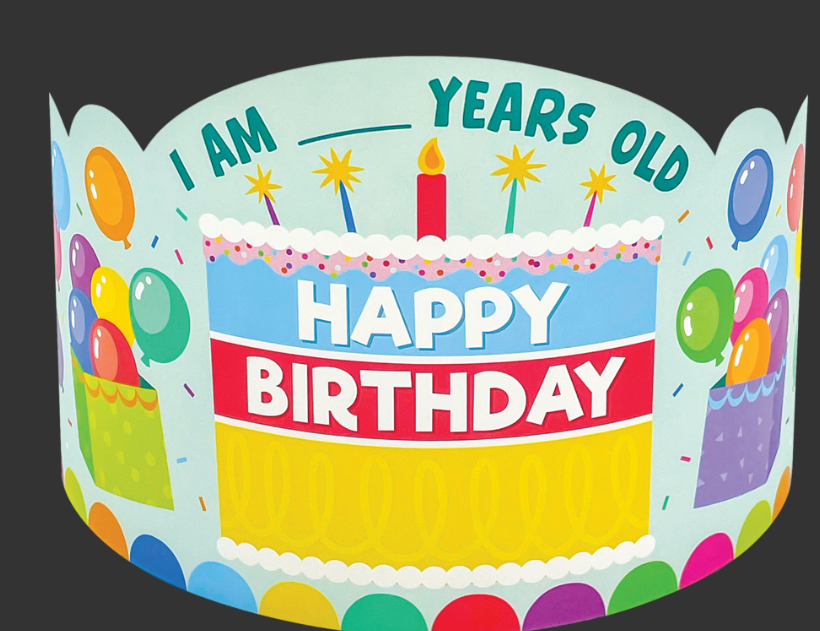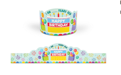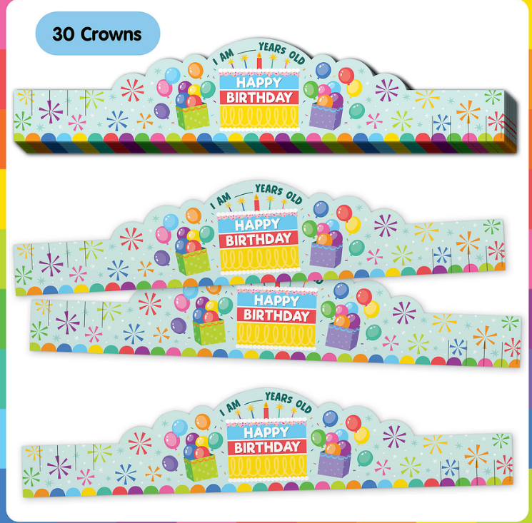 Celebrate every student’s birthday in colorful style with these birthday crowns! Featuring scallops, bursts, balloons, and a birthday cake, these bright crowns are the perfect favor for any class birthday party. Packs come with 30 crowns. Each crown measures 24" x 5".