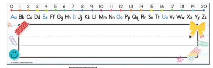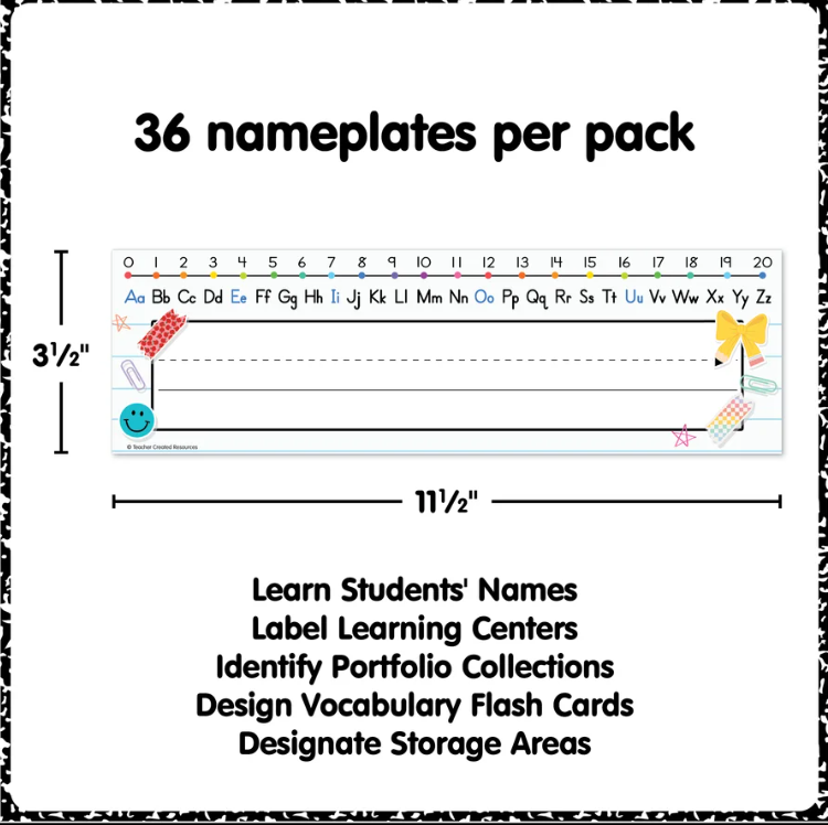 Bring a stylish touch to classroom organization with these modern name plates. Featuring school-themed motifs and prints, these plates are perfect for personalizing desks and getting to know your class. The alphabet (with vowels highlighted) and a 0–20 number line make useful references students can use again and again. Laminate for a lined writing space that students can use to properly align their letters, practice penmanship, and make their handwriting legible. The pack includes 36 plates printed on thick, coated paper stock. Each name plate measures 11-1/2" x 3-1/2".