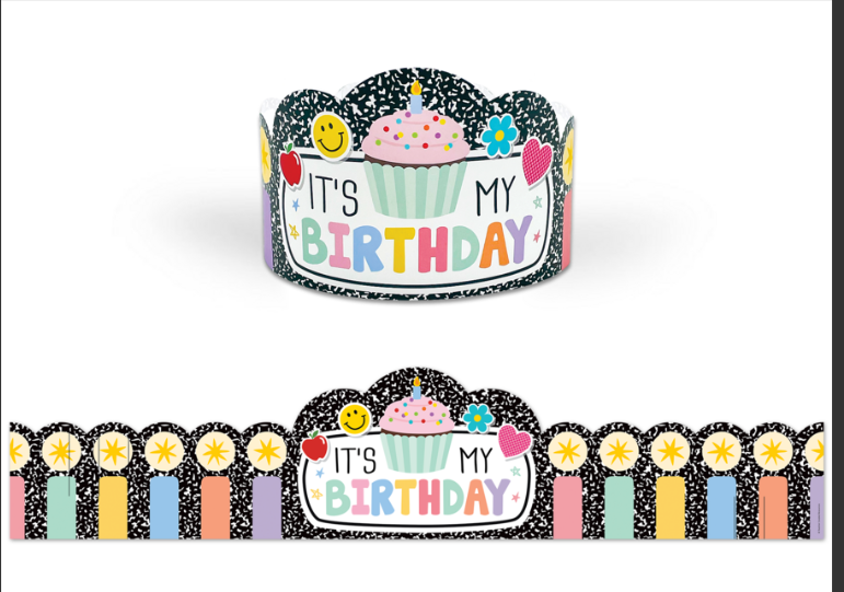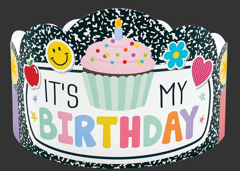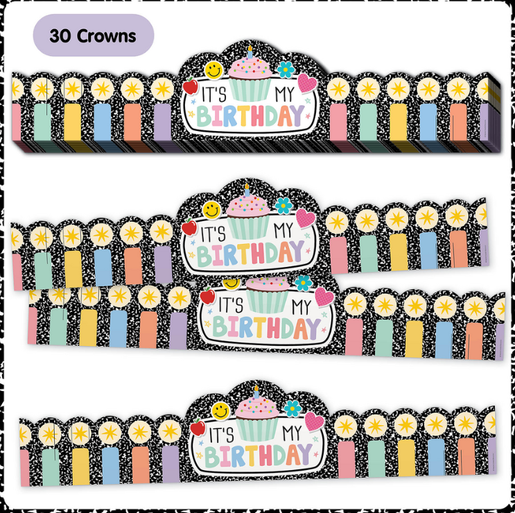 Make every birthday kid feel like royalty on their birthday with these festive crowns! Featuring a composition-print background, colorful candles, a cupcake, and an “It’s My Birthday” message, these crowns are perfect for celebrating every child’s special day, in class and beyond. Packs come with 30 crowns. Each crown measures 24" x 5".