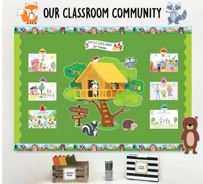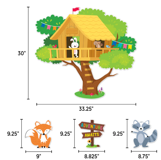 Bring the fun of a backyard treehouse to your learning environment with the Woodland Friends Treehouse Bulletin Board. This set features a big (33” x 30”) treehouse and these adorable woodland animals: bear, deer, raccoon, squirrel, skunk, rabbit, hedgehog, and owl. Set also includes motivating messages that promote a positive mindset.