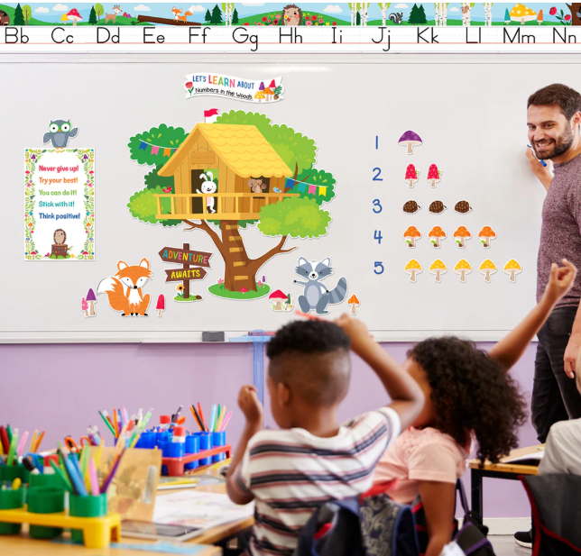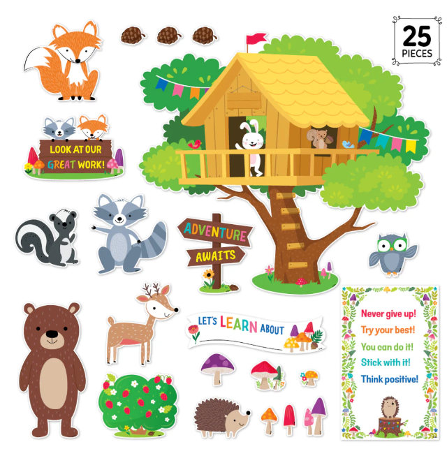 WHAT’S INCLUDED – This 25-piece bulletin board set comes with a big (33” x 30”) treehouse, adorable woodlands creatures, and motivating messages.