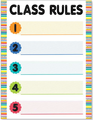 This NEW Class Rules Chart is part of the Core Decor Classroom theme. It features cheerful colours and dazzling patterns. Measures 17" x 22".