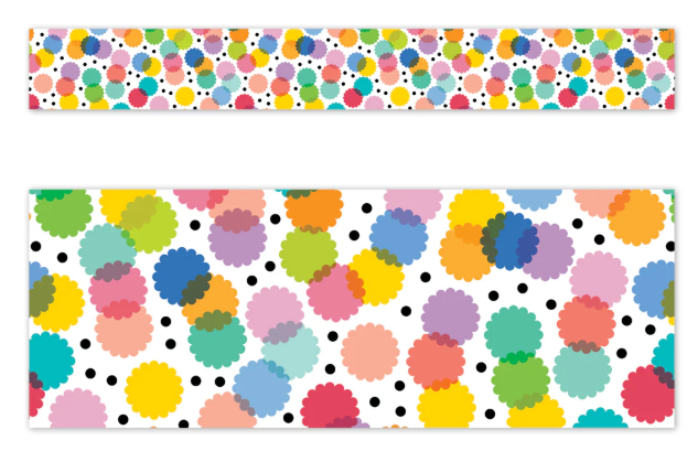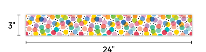 The Core Decor Spots and Dots EZ Border allows you to add fun and colorful dot art to your wall displays without the mess. Featuring dots in a random array of colors on a white background, this border will brighten any space. Perfect for use on bulletin boards in a wide variety of classroom, office, and school settings.