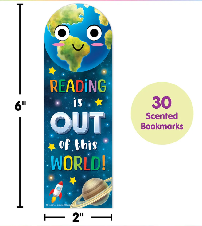 Take a reading journey to the cosmos with these scented bookmarks! Featuring space-themed art, a positive message, and a grape scent, these bookmarks are great for positive reinforcement. Use as treasure box prizes and student incentives, or give out alongside books at the library or book fair. Each pack includes 30 pieces. Each piece measures 2" x 6".