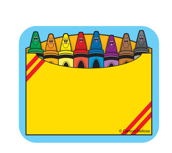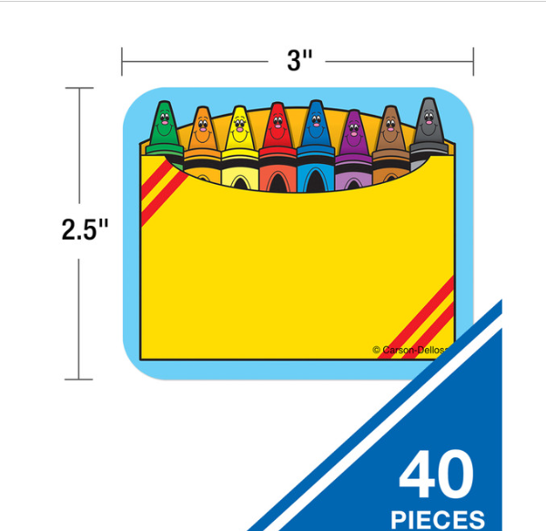 These convenient, self-adhesive Crayon Box name tags are ideal for labels, reminders, calendar and homework notes, and more! Each pack features 40 name tags, measuring 3" x 2.5”. Available in a variety of prints, name tags are fun addition to any classroo