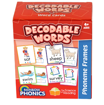 Decodable Words by Rainbow Phonics make word building easy, with sound buttons and phoneme frames to support decoding and encoding. The Rainbow Phonics Decodable Word pack contains 160 cards for teaching decoding and spelling words across the Rainbow Phonics progression. Each card is double-sided. On the front side is the decodable word, including a visual image and sound buttons beneath the word. The sound buttons are color-coded with short vowels in red and consonants in blue. There are also lines or dashes to represent digraphs and these are also color-coded according to their consonant or vowel pattern. On the reverse are phoneme frames, where phonemes are grouped into boxes and color-coded accordingly. This side has a write and wipe surface, so children can practice spelling the word or identifying a phoneme (sound) within the word. The outside borders are color-coded in accordance with the phases of Rainbow Phonics. Cards also integrate with the lessons in the Teacher Planners at the different grade levels.