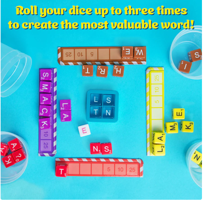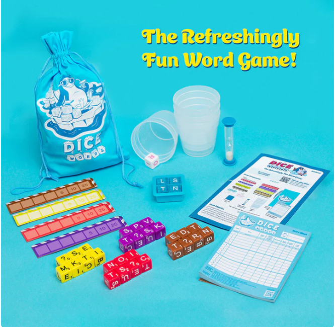 Each player begins by choosing a set of seven letter dice that each represent a different iced beverage. When the timer starts counting down, players attempt to form the longest and most valuable word possible. Don’t have the letters you need? Don’t worry! You can re-roll any of your dice up to two times before the round ends. But, things are not as simple as they seem: in addition to your individual letter dice, you must also try to incorporate the most “target letters” — four ice cube-shaped letter dice that are revealed at the beginning of each round. The colder your drink, the higher your score!