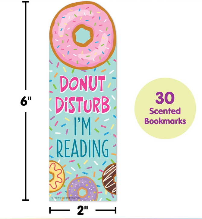 Donut disturb; reading in progress! Bring a playful touch to reading in class with these smelly bookmarks. Featuring colorful art, a funny phrase, and a donut scent, these bookmarks are great for treasure box prizes, student incentives, and reading reward