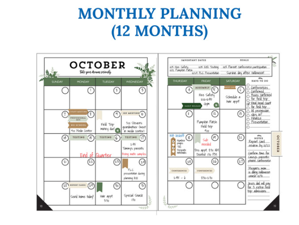 The spiral-bound planner has everything you need to set your school year up for success, including undated yearly goal planning, monthly calendars, and weekly lesson plans. Communication logs, checklist pages, contact pages, substitute information, and a notes section are also included with ample writing space. This plan book also includes 116 colorful stickers, including 16 tabs, 9 to-do lists, 64 reminders, 6 notes, and 21 accent stickers to customize, organize, and track progress in your teacher planner throughout the school year.