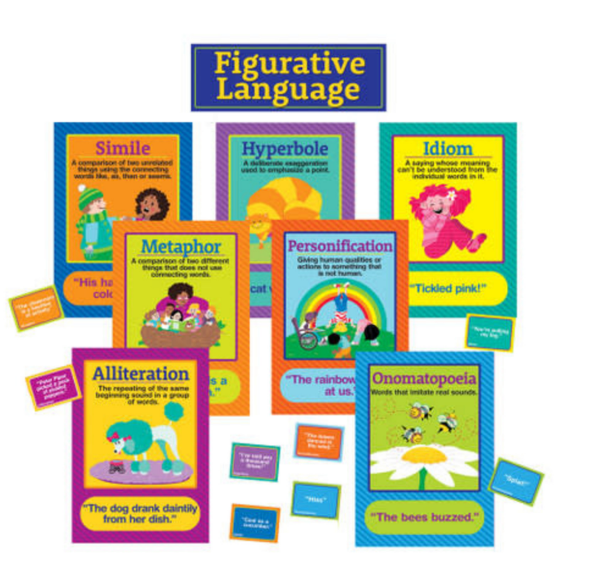 7 Colorful Mini Posters (each measuring 12" x 17") illustrating seven types of figurative language: Simile, Metaphor, Idiom, Hyperbole, Alliteration, Onomatopoeia and Personification, a Teacher Guide and eight mini signs with additional example phrases.