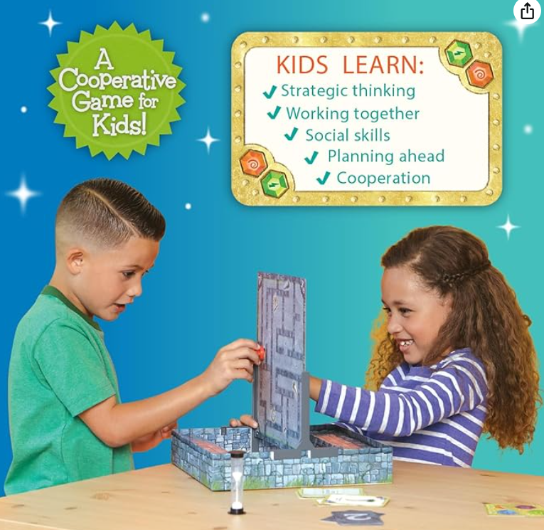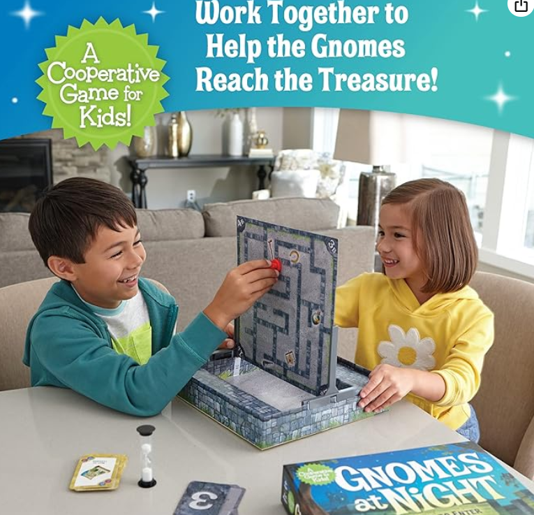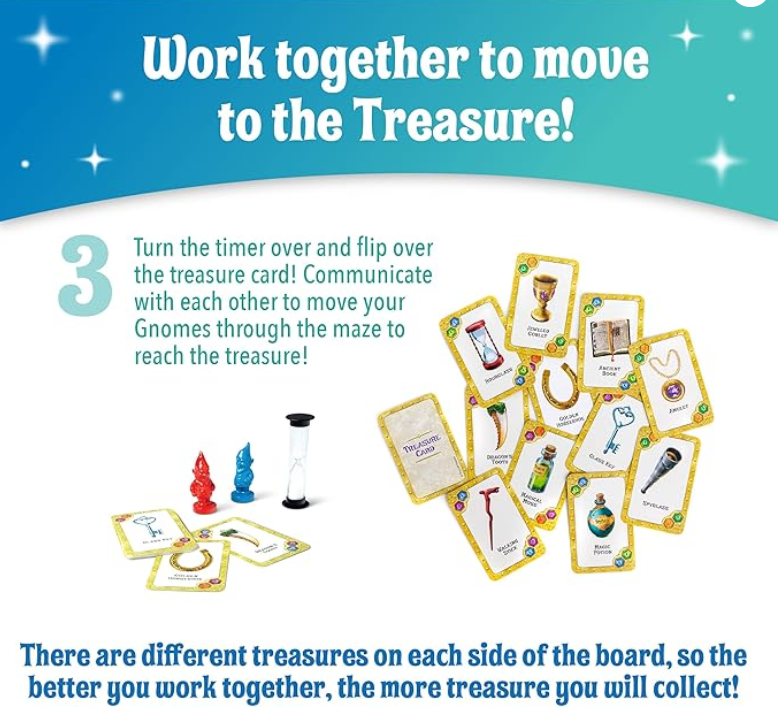 - TOYS THAT TEACH: Gnomes at Night is a great way to develop effective communication skills. Players race to identify the treasure as shown on the card to determine which side of the board that treasure is located on. Players work together maneuvering through the maze, sometimes you will be able to move easily toward the treasure, sometimes you will need to back track. Using descriptive language like left, right, up and down will help your teammate better assist you in collecting that treasure.