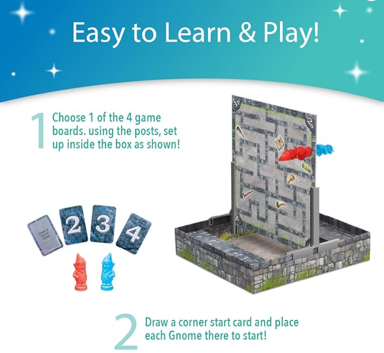 - INCLUDES: 4 game boards (levels A thru D), 12 treasure cards, 2 game board holders, 2 team cards, 2 magnetic gnome movers, 4 corner-start cards, 1 sand timer and instructions.