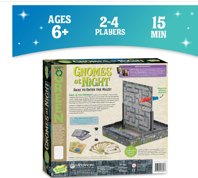 - DARE TO ENTER THE MAZE: Gnomes at Night is a cooperative search-and-find maze game where players work as a team to maneuver the magnetic gnome movers around the maze. Work together in this quick-thinking communication game where every second counts!
