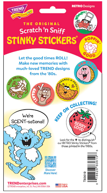Get a whiff of this Gooble! Gooble!, spice-scented turkey sticker! TREND Scratch 'n Sniff Stinky Stickers® from the '80s are BACK! And they're SCENT-sational! Fun to collect, trade, and celebrate accomplishments and special occasions. Collectors will be happy to spot the ★ to distinguish TREND Retro Stinky Stickers® from those printed in the 1980s.