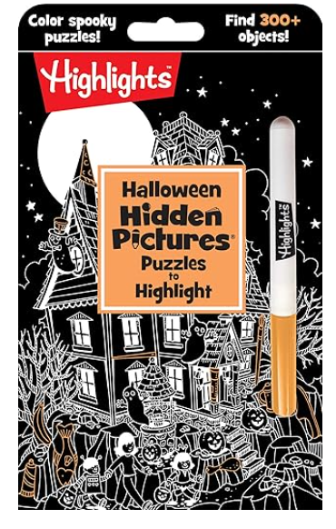 A spooky twist on everyone’s favorite seek-and-find puzzles, this Halloween activity book is a trick and treat. This 48-page book combines the fun of coloring with highlighters and the enduring popularity of Hidden Pictures puzzles. Silly haunted houses, trick-or-treat outings and pumpkin patches are some of the scenes kids will enjoy in this Halloween-themed puzzle collection. Hidden Pictures fans will love creating eye-popping artwork as they find and color 300-plus hidden objects throughout these puzzles. With a highlighter included, this book is ready for young puzzlers to take anywhere for independent, screen-free entertainment. Plus, searching for objects help kids improve concentration, attention to detail and persistence.