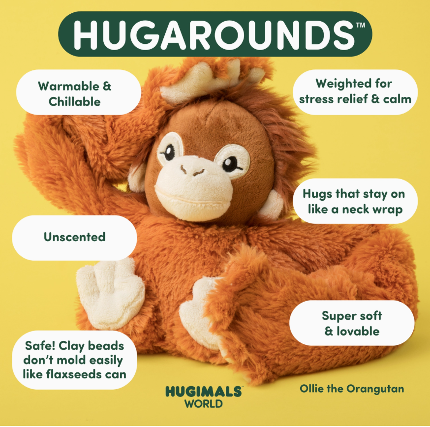 • Long, comforting weighted arms or wings for hands-free hugs that stay even when you move!