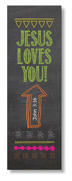 Bright "chalk" colors pop on the blackboard background of this bookmark. Remind students in your Sunday School class or small group that Jesus loves them. 36 per package, measure 2 x 6-1/2".