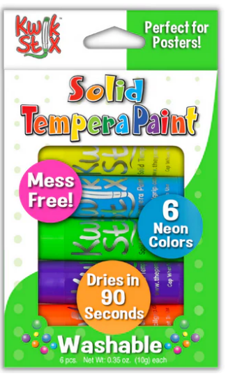 6 bright neon Kwik Stix Solid Tempera Paint with the 90 second dry time! They even glow under a black light! No cups, smocks, water or brushes needed. Great on poster paper, cardboard, wood and canvas - and MORE!