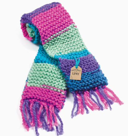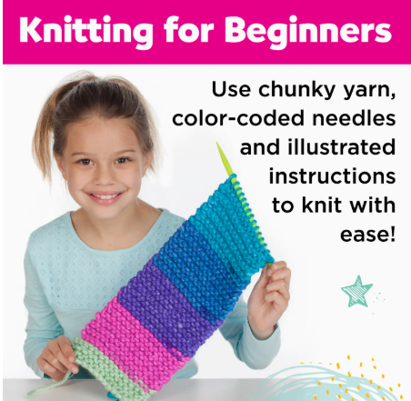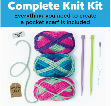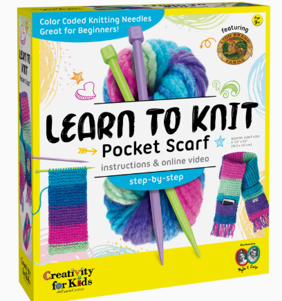 Learn to knit while you create your own vibrant and functional pocket scarf! Beginners and kids will find creating their own scarf simple and fun with the provided chunky yarn, color-coded knitting needles, illustrated instructions and how-to videos Comes with everything you need to make your own kids scarf! This knitting kit includes 135 yards of rainbow yarn, plastic knitting needles, plastic darning needle, embroidered patch, needle threader, cardstock gift tag, step-by-step illustrated instructions and online video tutorial When you finish your knitting project place your keepsakes safe in the pocket and wear the colorful scarf around your neck as a warm and fuzzy fashion statement! Knitting is a calming and educational craft activity! The repetitive motions of knitting provide a mindful and enjoyable experience that builds critical thinking skills, fine motor coordination, math, comprehension, planning and problem solving Learn to knit with ease using Learn to Knit Pocket Scarf!