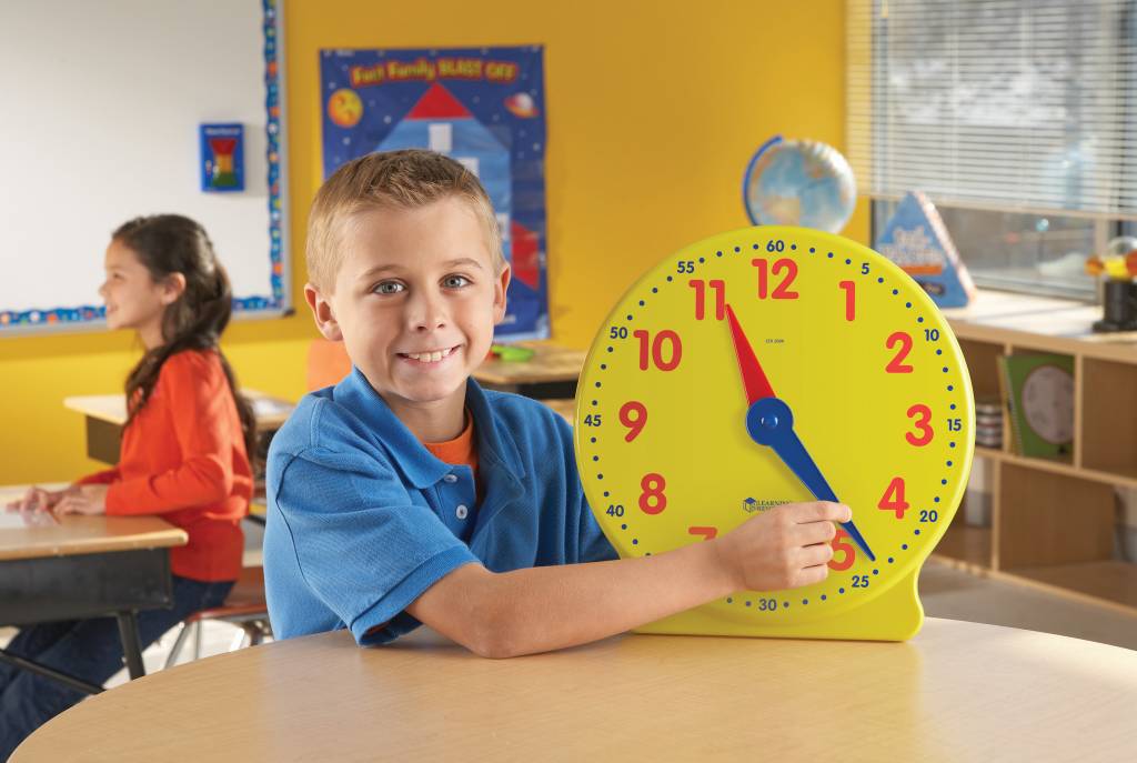 This 12-Hour demonstration clock is a great way to help kids grasp time-telling skills. A hidden mechanism maintains correct hour and minute relationships. This clock has easy-to-ready hour and minute markings. There is also a removable stand.