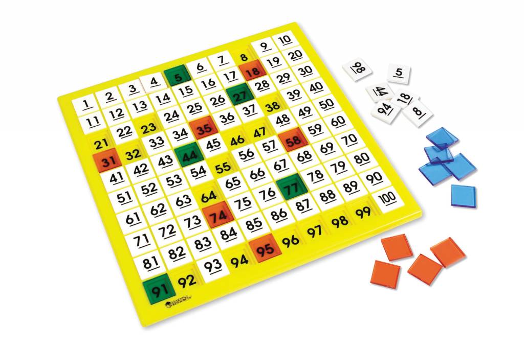 Introduce number patterns, sequencing and place value with this durable plastic Hundreds Number Board with recessed squares. Double-sided board features numbers printed on the front and a plain grid for additional patterning and graphing activities on reverse. Includes 100 numbered white tiles, 25 transparent red tiles and 25 transparent blue tiles.