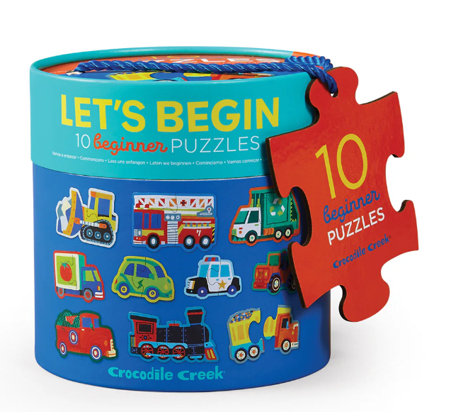 Crocodile Creek Let’s Begin puzzles are perfect for a toddler’s very first learning experience! Each puzzle set is cleverly packaged in a sturdy canister with a rope handle and a puzzle piece on the outside to show puzzle quality on the inside.