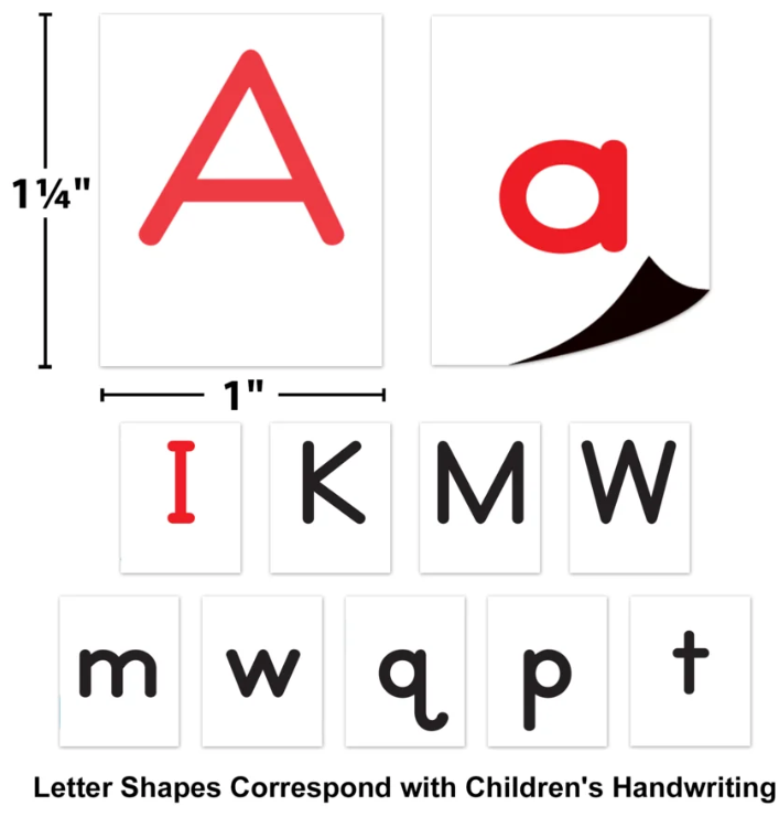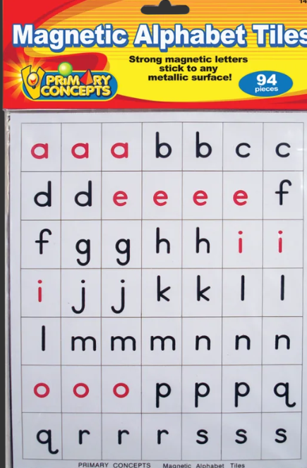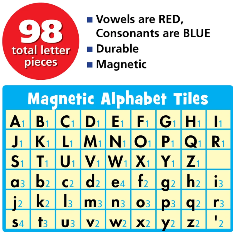 Includes 2 to 4 of each letter of the alphabet in lowercase letters, plus 26 uppercase letters and two apostrophes. Vowels are in red and consonants are in black. Measures 1" x 1¼". 98 total pieces.