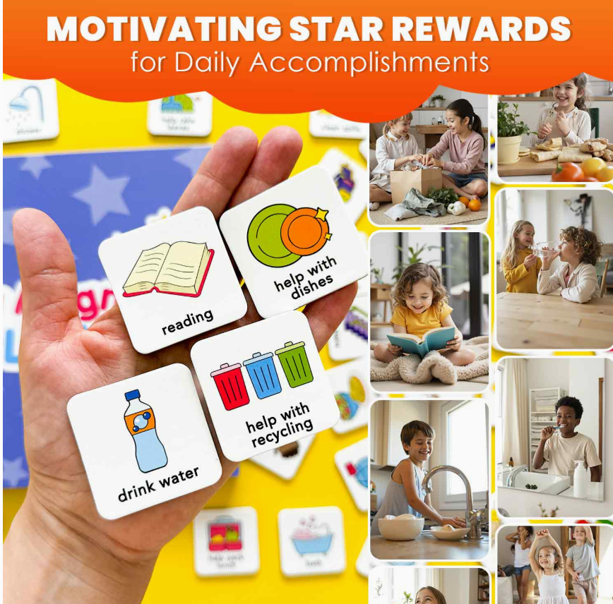 * Designed to make daily routines engaging, this visual schedule helps children understand tasks, track their progress, and feel a sense of achievement.