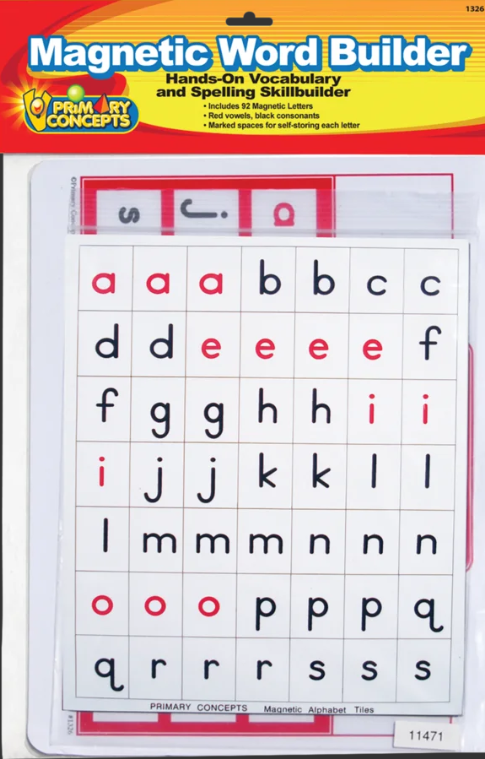 Build, rearrange, and explore the world of words with this engaging magnetic board set. Comes with 98 magnetic letter tiles (with vowels in red and consonants in black) and a 12" x 9" magnetic board.