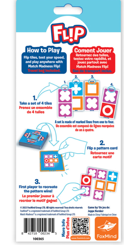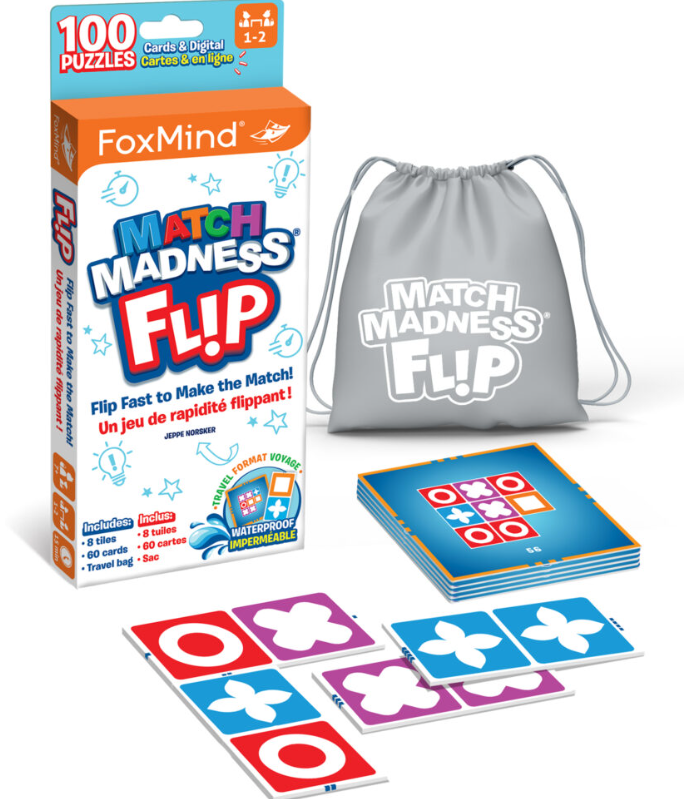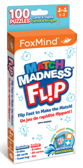 Puzzle Board Games on The Go: Bring the Match Madness experience anywhere! This compact version of the classic favorite comes with waterproof cards and tiles and a travel bag. Set the game up in a few seconds and be transported by Match Madness Flip!
