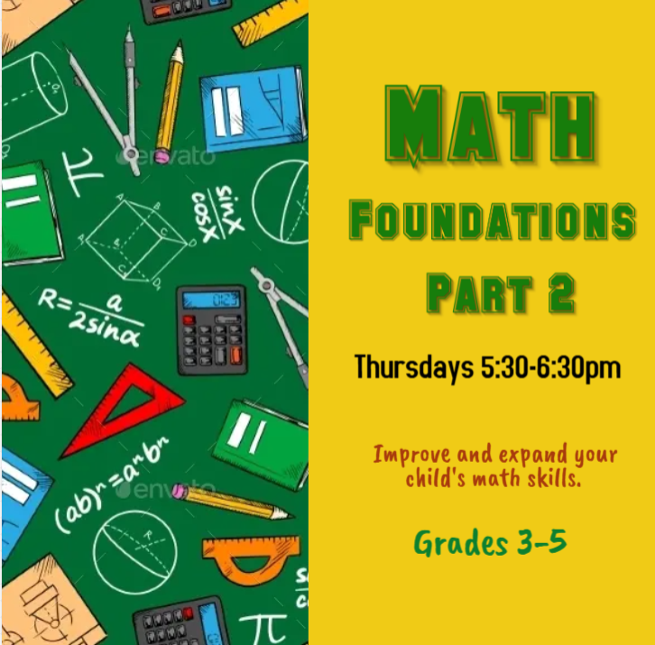 Students in grades 3+ are invited to join us in the classroom for this 8-Week Math extravaganza! We will work through a variety of math topics including: multiplication, division, fractions, algebra, problem-solving and more!