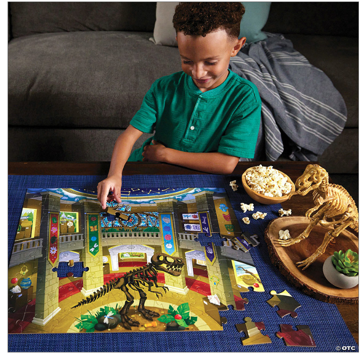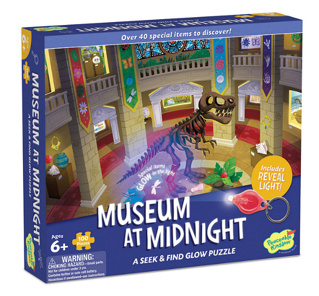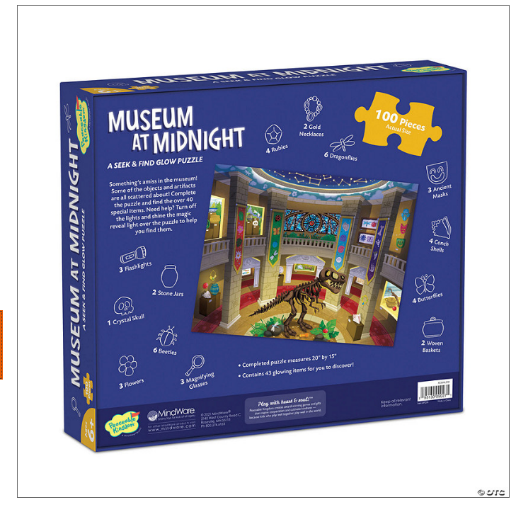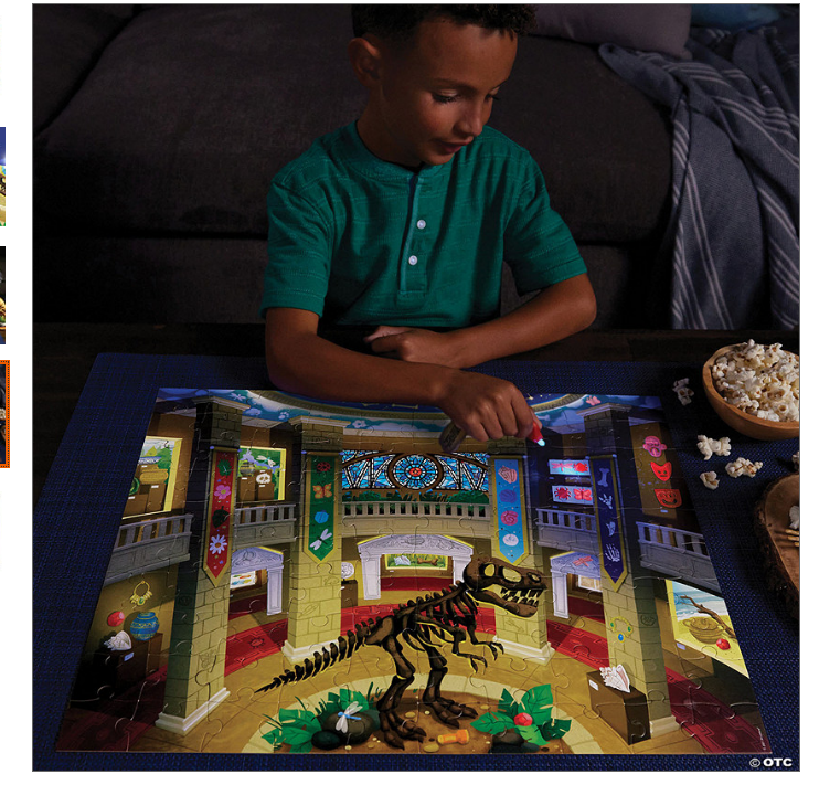 Scour this puzzle for hidden items! Over 40 glow-in-the-dark objects are waiting to be spotted by eagle-eye explorers. Assemble the puzzle to create a detailed scene, then use the included reveal light to find each mystery item!
