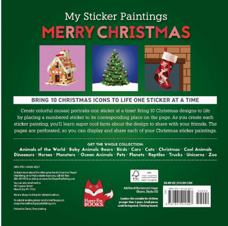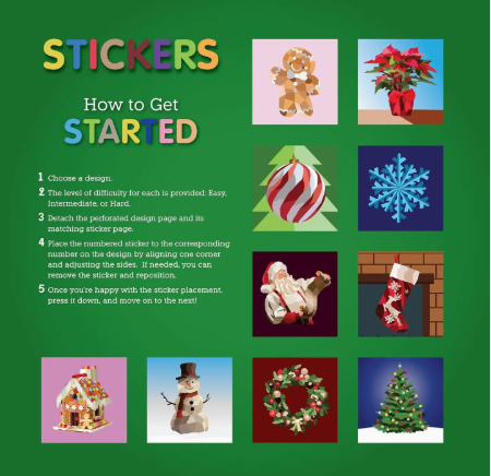 Create stunning works of holiday-themed mosaic art with stickers! This distinctive poly-art sticker painting book for kids features a collection of 10 festive portraits including Santa Claus, snowman, holiday wreath, Christmas stocking, and gingerbread house. To create each portrait, affix the numbered colored sticker to the corresponding number on the design's pattern. Stickers are removeable and reusable for repositioning and transforming into beautiful, crystalized mosaic portraits. Also included are fun facts about about the holiday and each holiday icon. An entertaining, hands-on activity for kids, this sticker painting book offers an excellent opportunity for developing their focus and attention span. Designs are printed on thick, perforated pages that can easily detach to be displayed or gifted once a painting is completed.