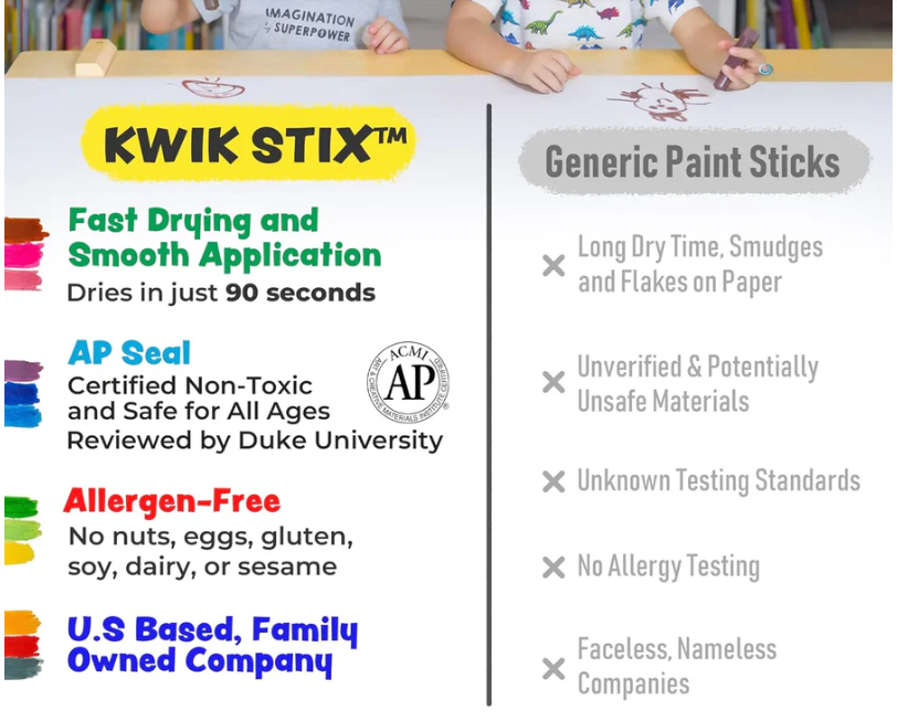 Washable & Easy Cleanup: Kwik Stix wash off easily from hands, clothes, and surfaces, making cleanup a breeze after every creative session.