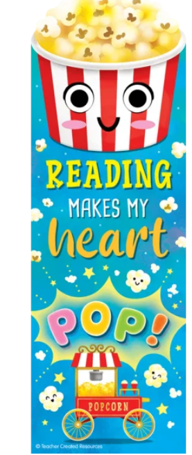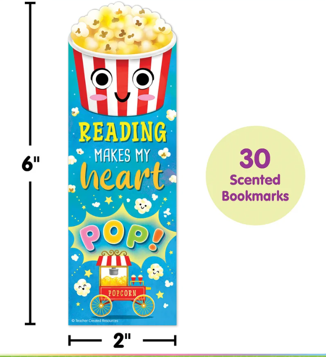 Pop some sensory fun into story time with these bookmarks. Featuring adorable art, a positive message, and a popcorn scent, these bookmarks are great for positive reinforcement. Use as treasure box prizes, student incentives, or reading rewards. Tuck them into bags at the book fair or library. Each pack includes 30 pieces. Each piece measures 2" x 6".